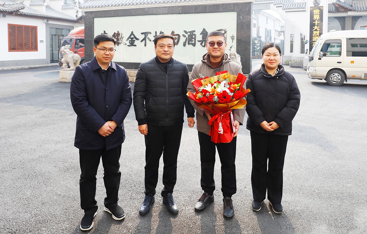 新春佳節(jié),區(qū)委書(shū)記周霄一行來(lái)到金不換白酒集團(tuán),走訪慰問(wèn)企業(yè)全體職工,送來(lái)黨和政府的關(guān)懷和溫暖,致以新春?jiǎn)柡蚝兔篮米T浮?br/>